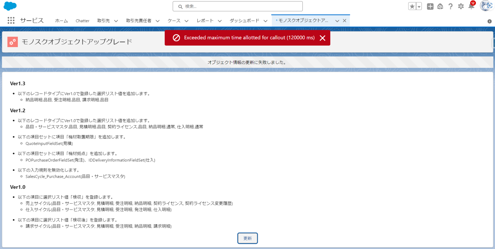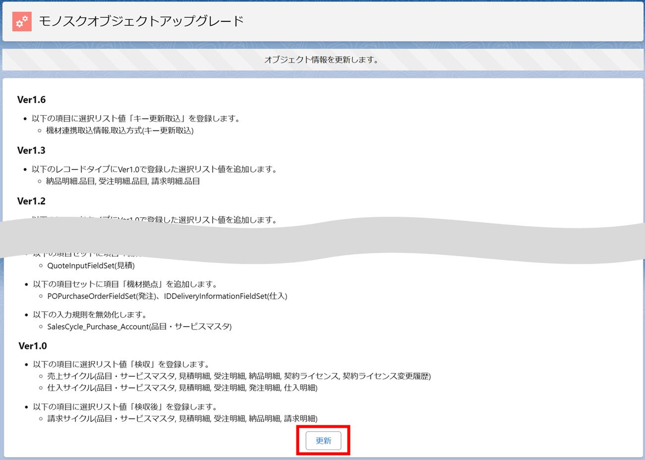 - 「モノスクオブジェクトアップグレード」画面が表示されます。[更新]ボタンをクリックします。