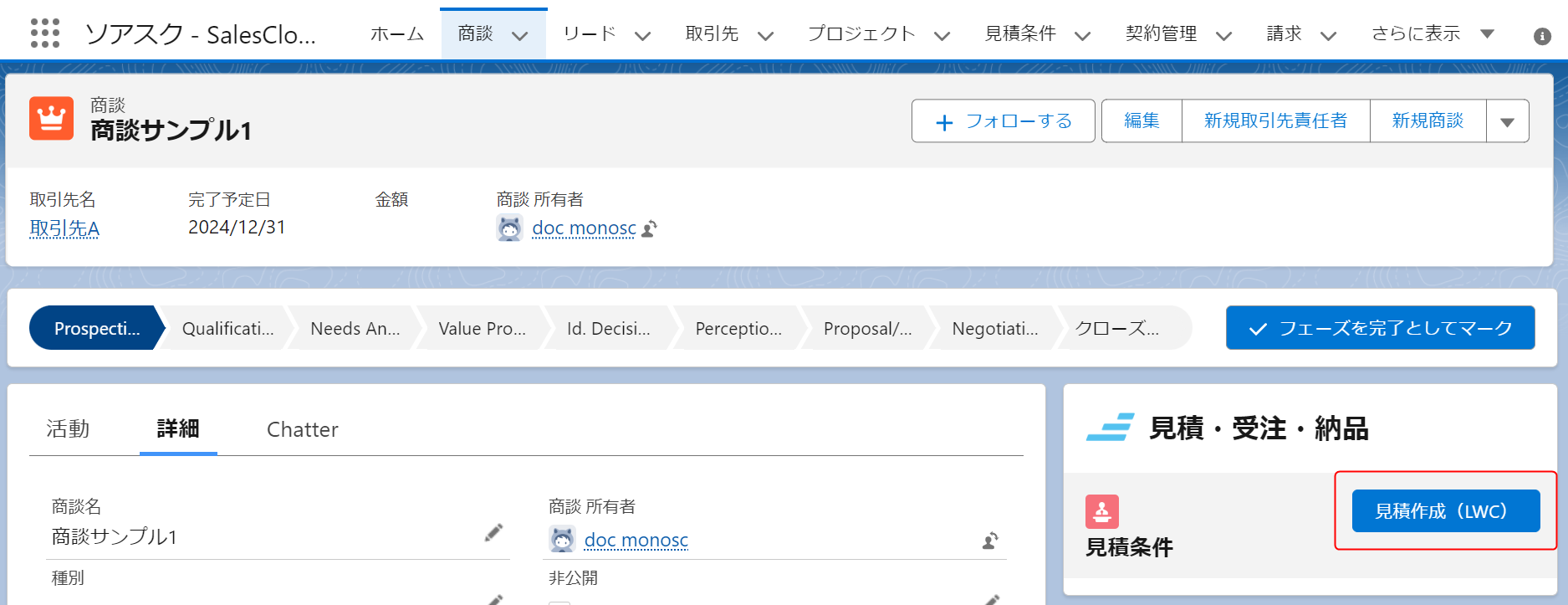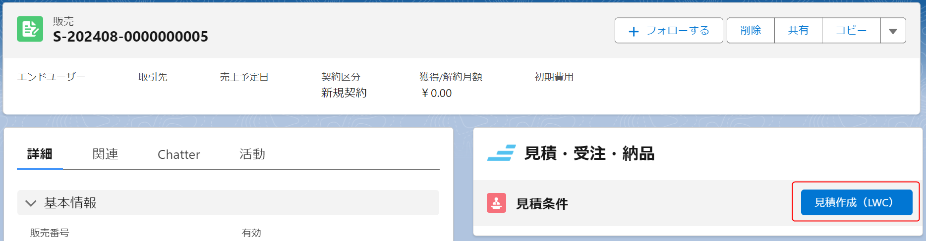 「販売」に紐づける場合は、「販売」詳細画面の関連リストで[見積作成(LWC)]ボタンをクリックします。
