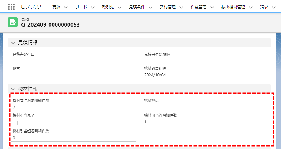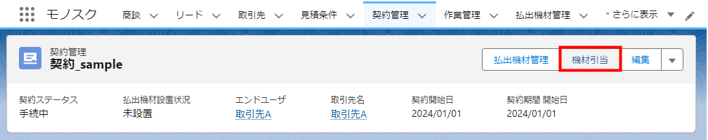 3. 「契約管理」の詳細画面が表示されます。[機材引当]をクリックします。