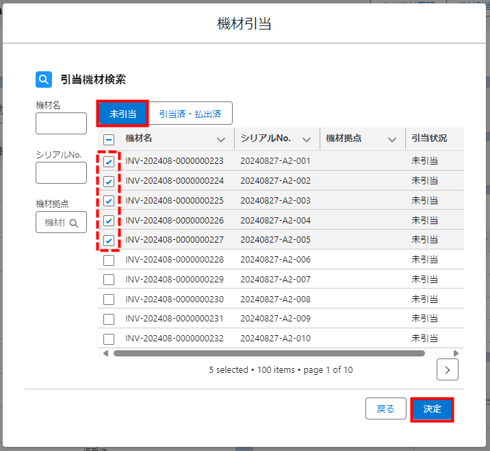 5. [未引当]のリストの中から引き当てる機材にチェックを入れます。複数チェックを入れる場合は[shift]を押しながら最終行をクリックします。選択し終わったら[決定]をクリックします。