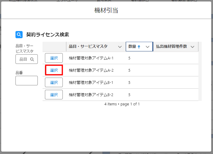 4. 機材引当する対象の契約ライセンスを選択する画面が表示されるので、対象となる契約ライセンス行の[選択]をクリックします。