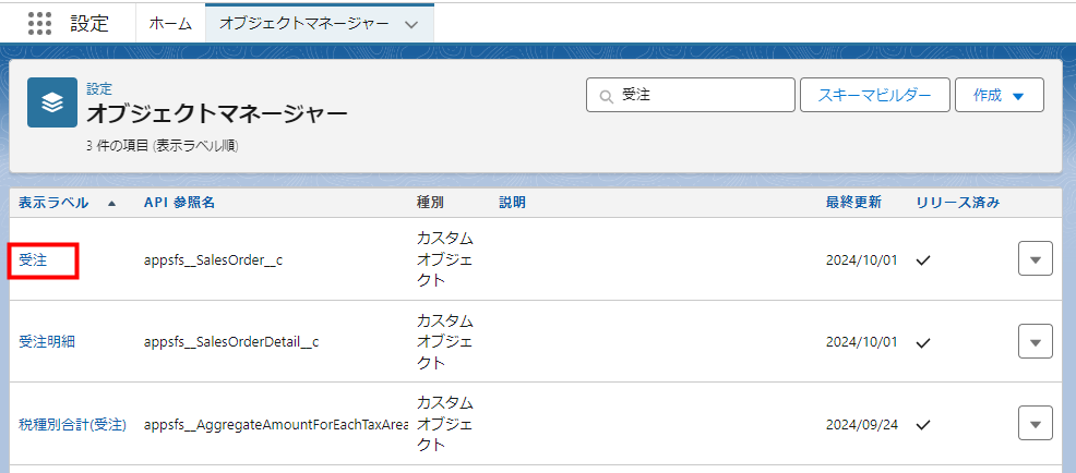 - 「契約管理のページレイアウトを変更する」の手順 1~2 で、「オブジェクトマネージャ」画面を開きます。