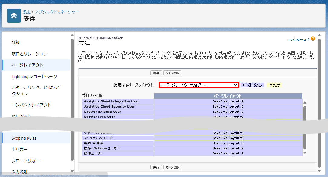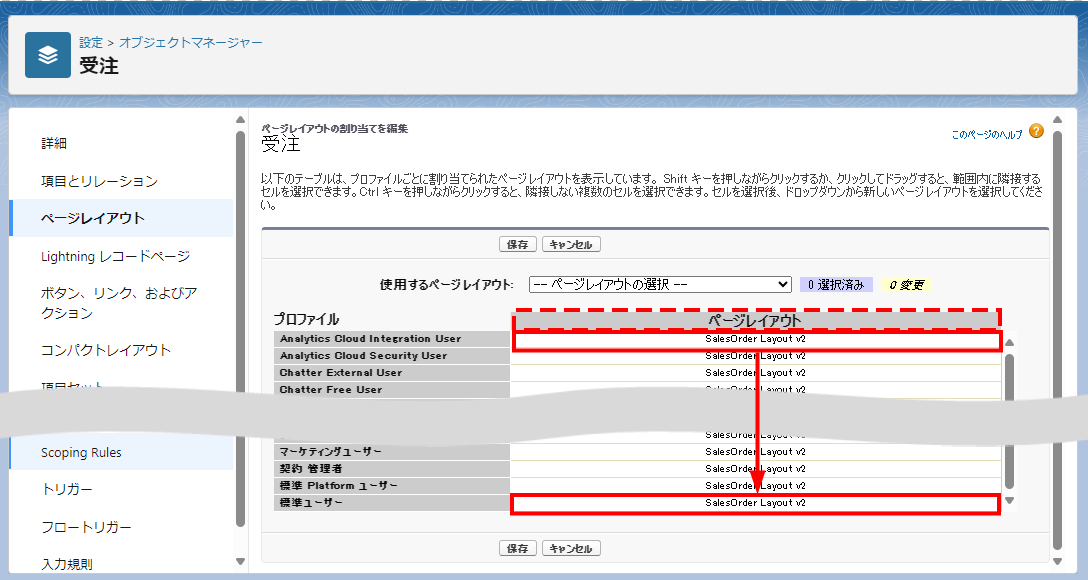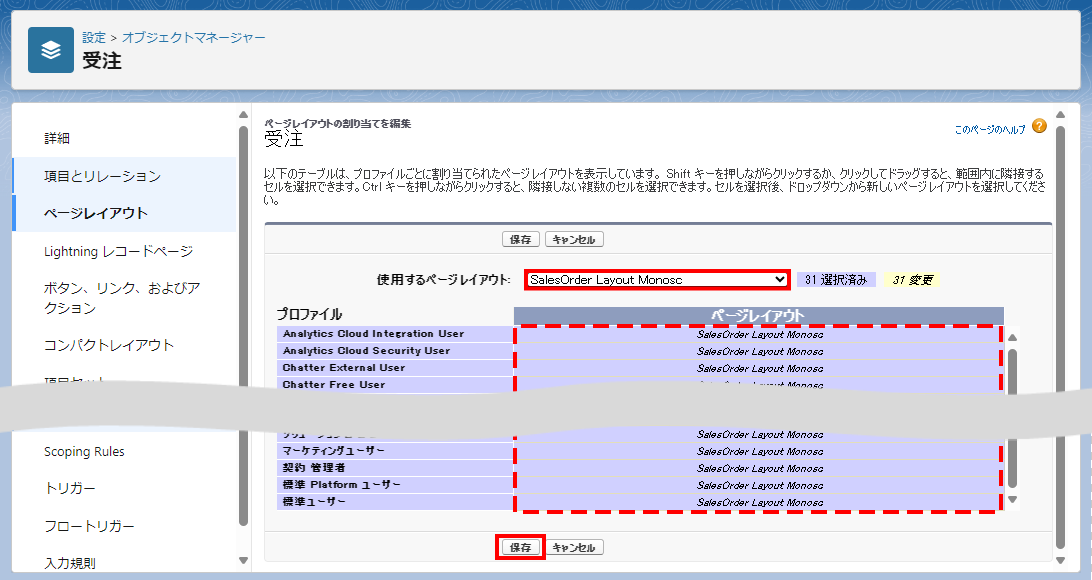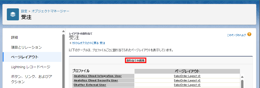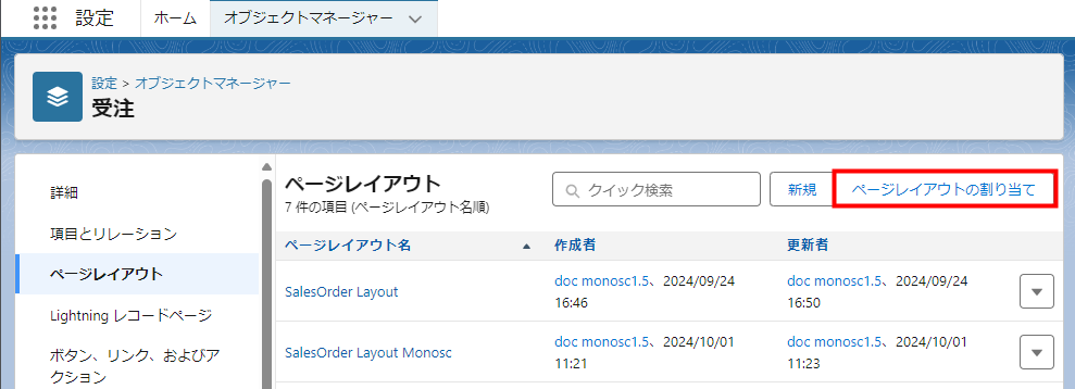 ここでは例として、すべてのプロファイルにページレイアウト「SalesOrder Layout Monosc」を割り当てます。
