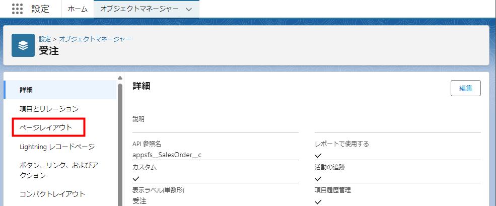 - 「受注」の「詳細」画面が表示されます。サイドバーの[ページレイアウト]をクリックします。