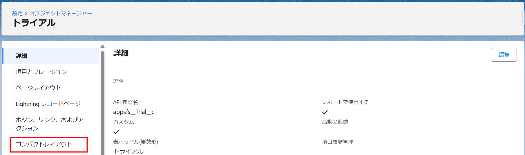 v1.7より追加されたトライアル管理機能を利用する場合は、「トライアル」のコンパクトレイアウトを「trialCompactLayouts」に変更します。