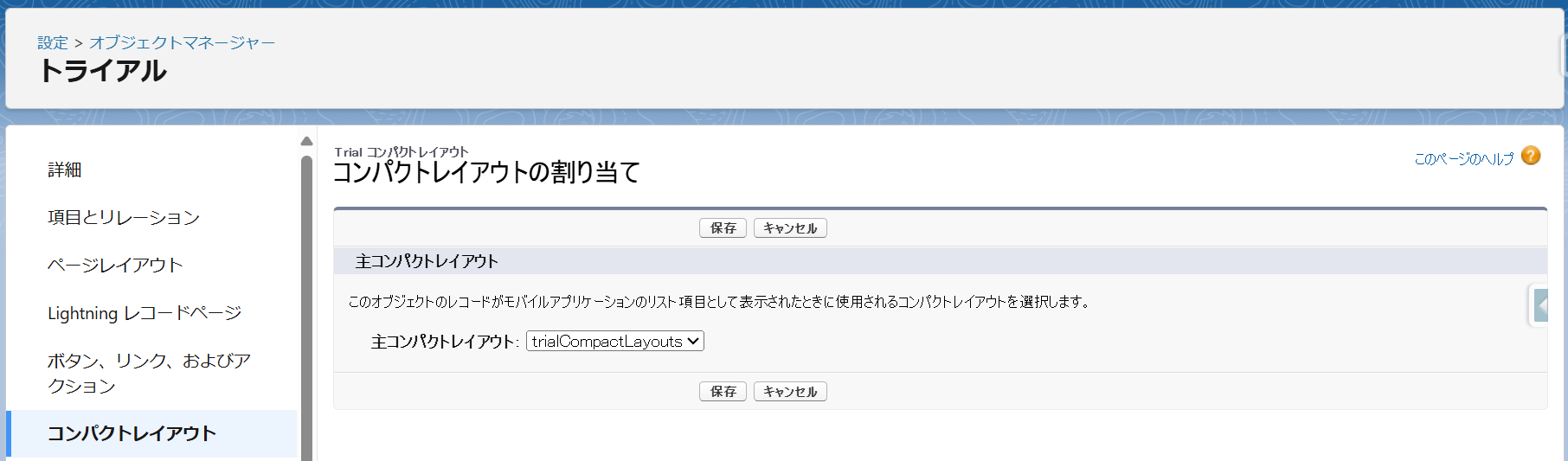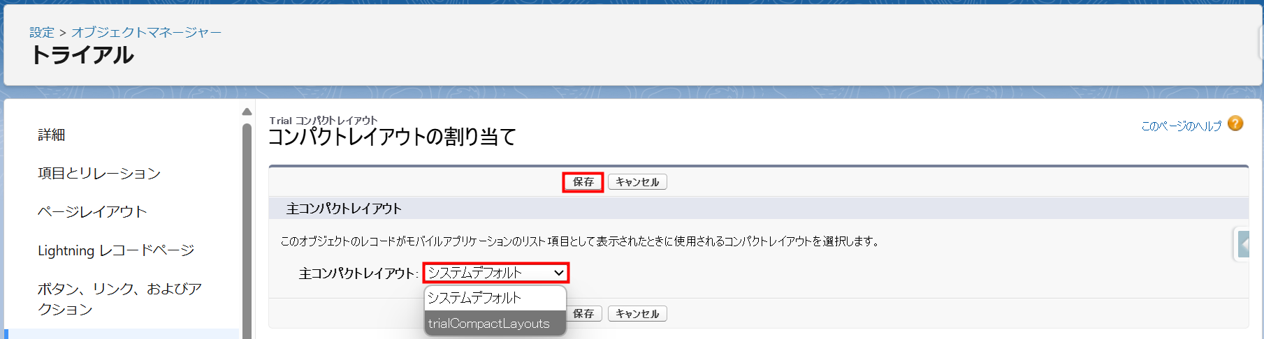- 割り当ての編集画面に切り替わります。「主コンパクトレイアウト」を「システムデフォルト」から「trialCompactLayouts」へ変更します。