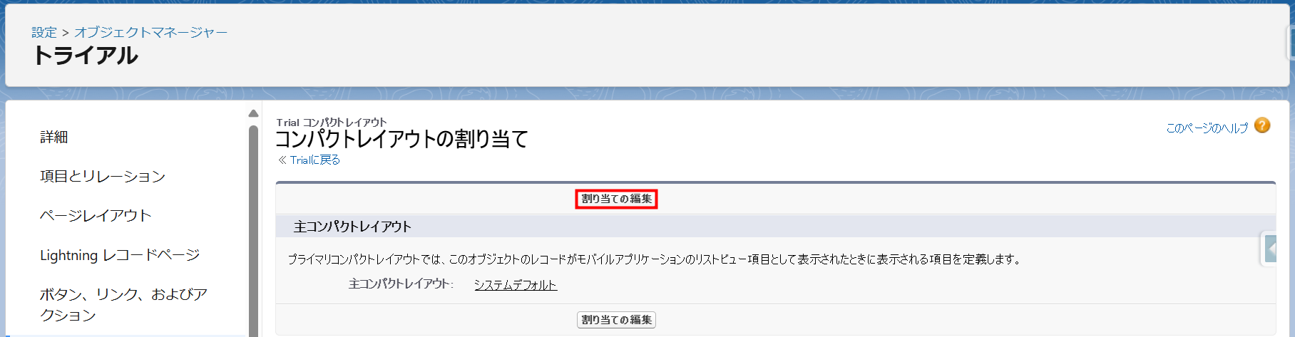 - 「トライアル」の「コンパクトレイアウトの割り当て」画面が表示されます。[割り当ての編集]ボタンをクリックします。