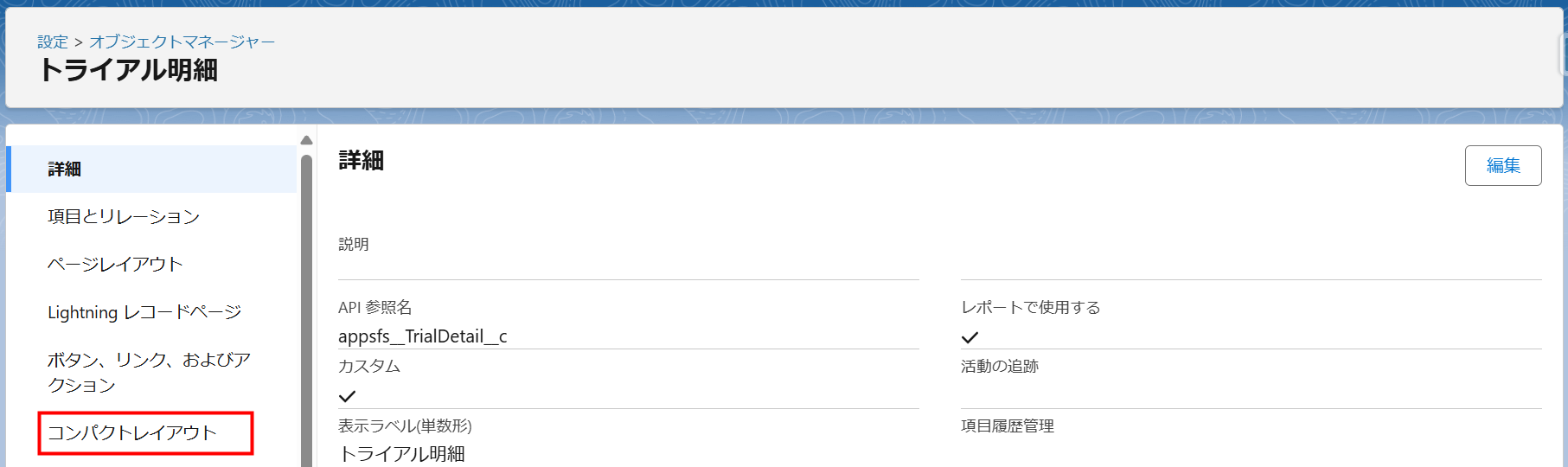 v1.7より追加されたトライアル管理機能を利用する場合は、「トライアル明細」のコンパクトレイアウトを「TrialDetailCompactLayouts」に変更します。