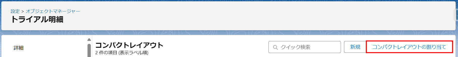 - 「トライアル明細」の「コンパクトレイアウト」画面が表示されます。[コンパクトレイアウトの割り当て]をクリックします。