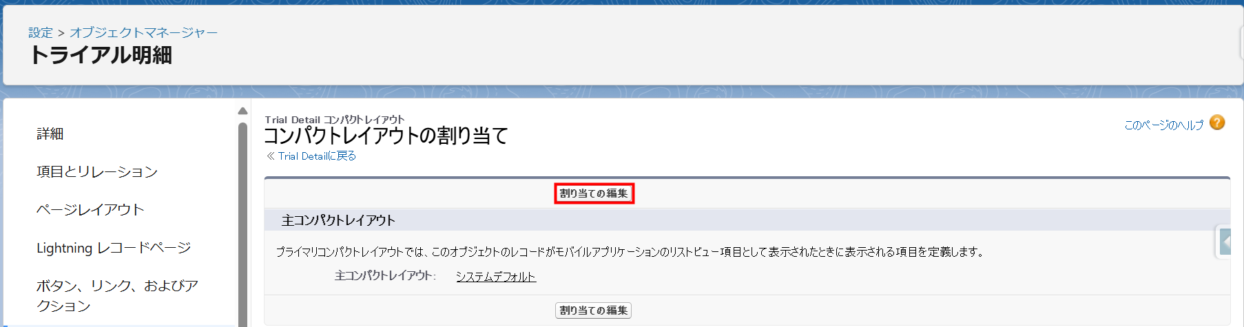 - 「トライアル明細」の「コンパクトレイアウトの割り当て」画面が表示されます。[割り当ての編集]ボタンをクリックします。