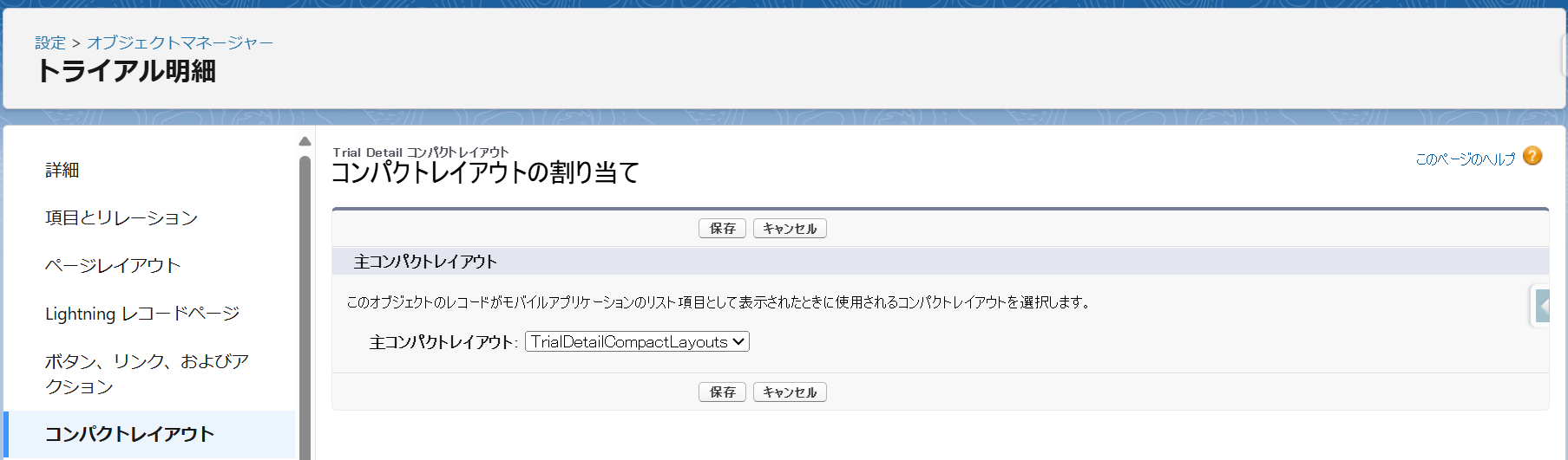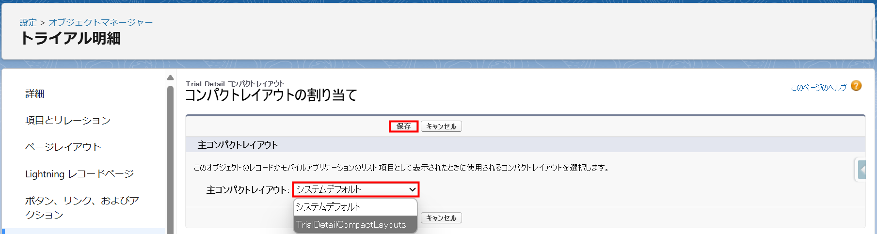- 割り当ての編集画面に切り替わります。「主コンパクトレイアウト」を「システムデフォルト」から「TrialDetailCompactLayouts」へ変更します。