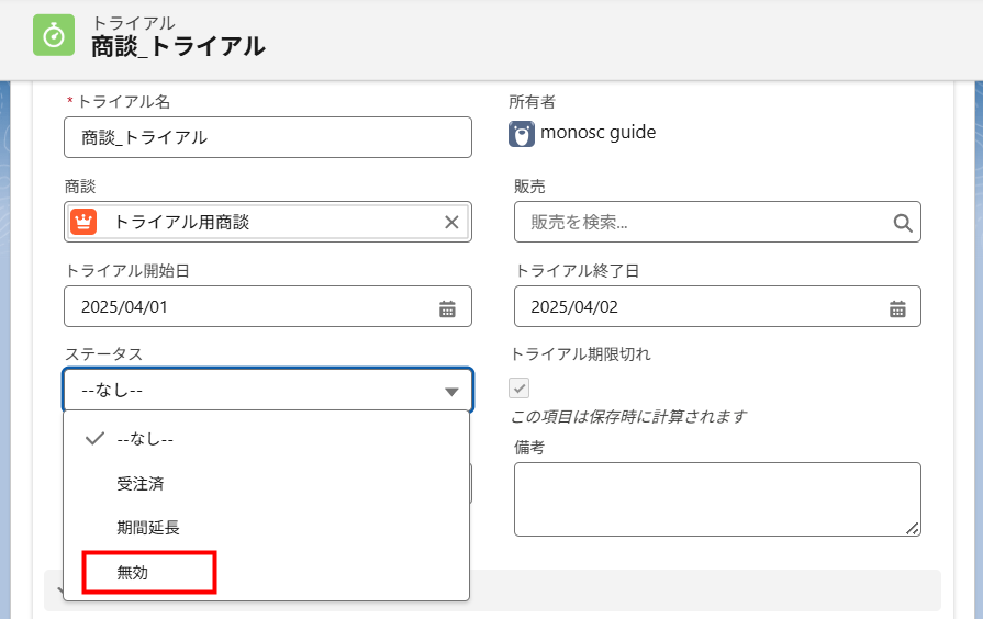 トライアルの期間延長をした場合「ステータス」を「期間延長」に設定したトライアルは、トライアル明細が契約ライセンスと紐づかず、受注確定後も「ステータス」が保持されます。 そのため、期間延長した上で成約・受注確定まで進んだ場合には、手動でトライアルの「ステータス」を「受注済み」に変更してください。 |