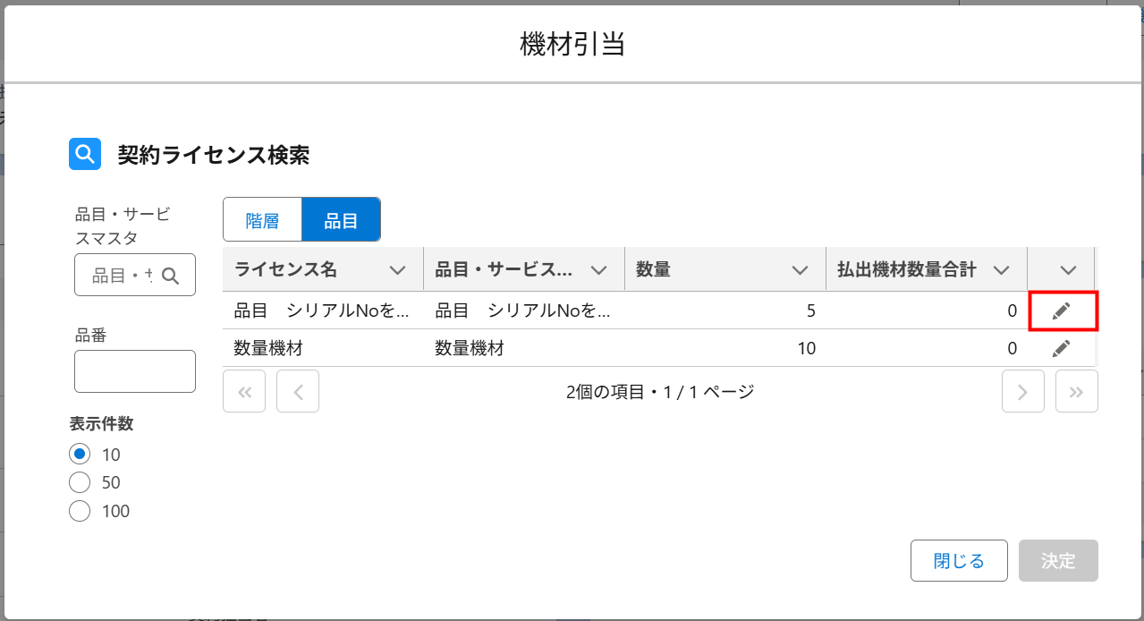 機材引当を行う契約ライセンス行の「編集アイコン」をクリックします。