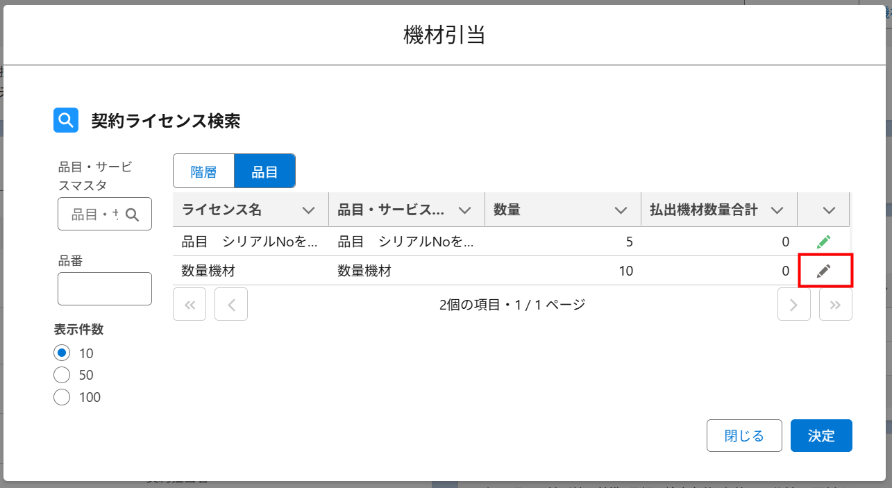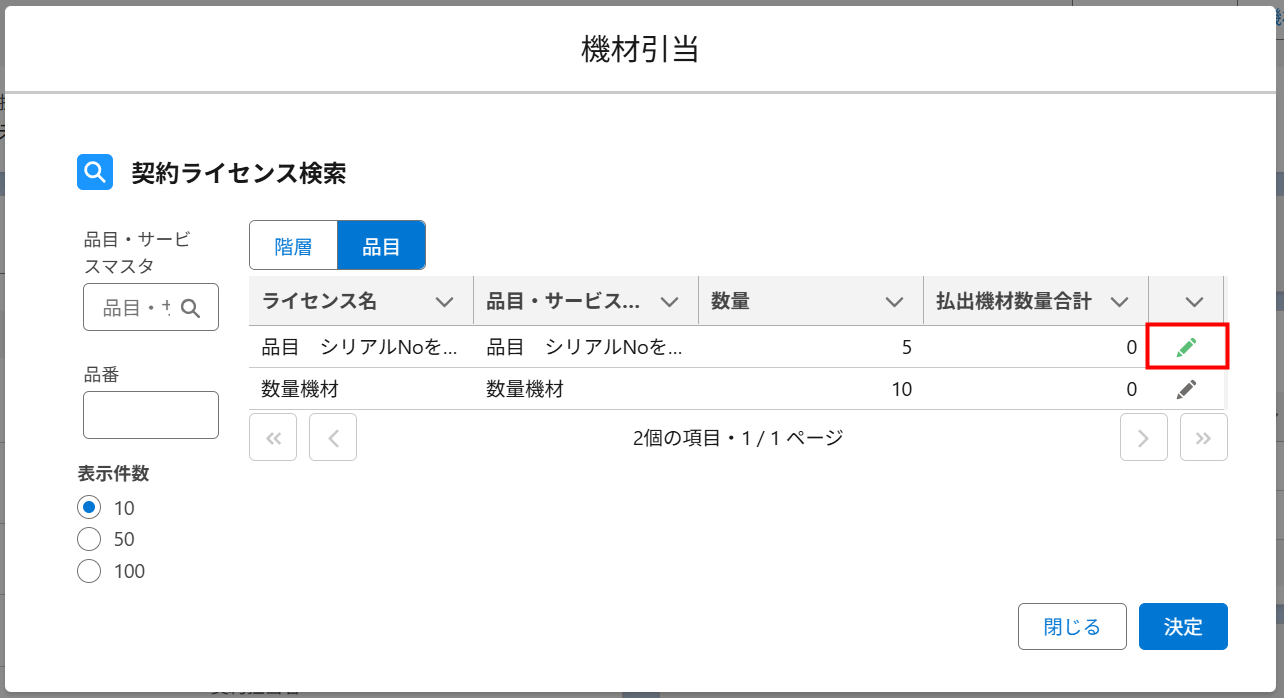 - [決定]ボタンをクリックすると、引き当てる機材・数量機材を選択した契約ライセンスの「編集アイコン」が緑に変化します。
