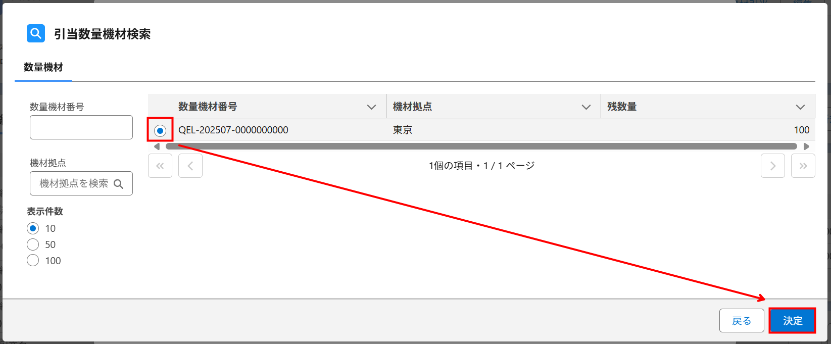 機材拠点を選択し、[決定]ボタンをクリックします。