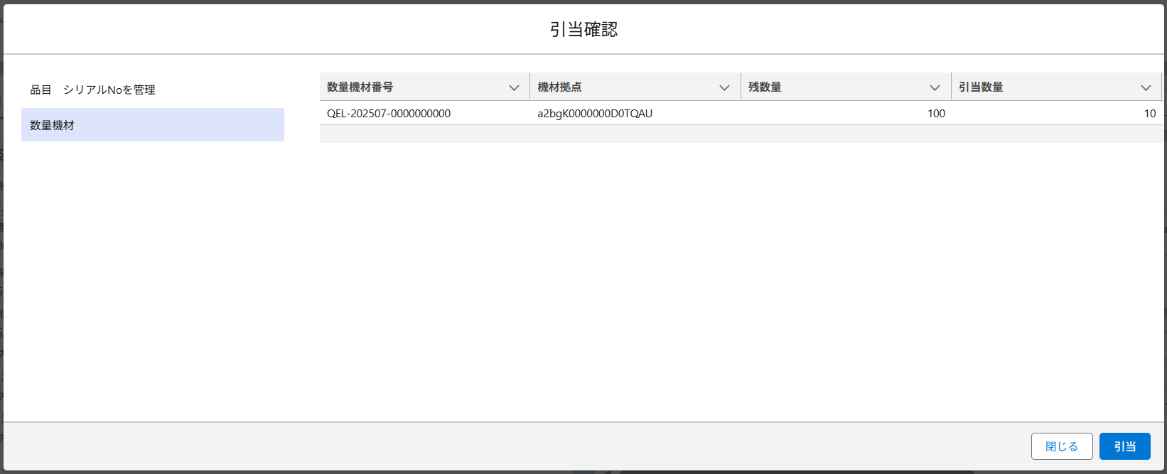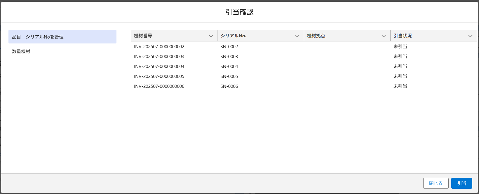 数量機材のライセンスでの引当確認画面